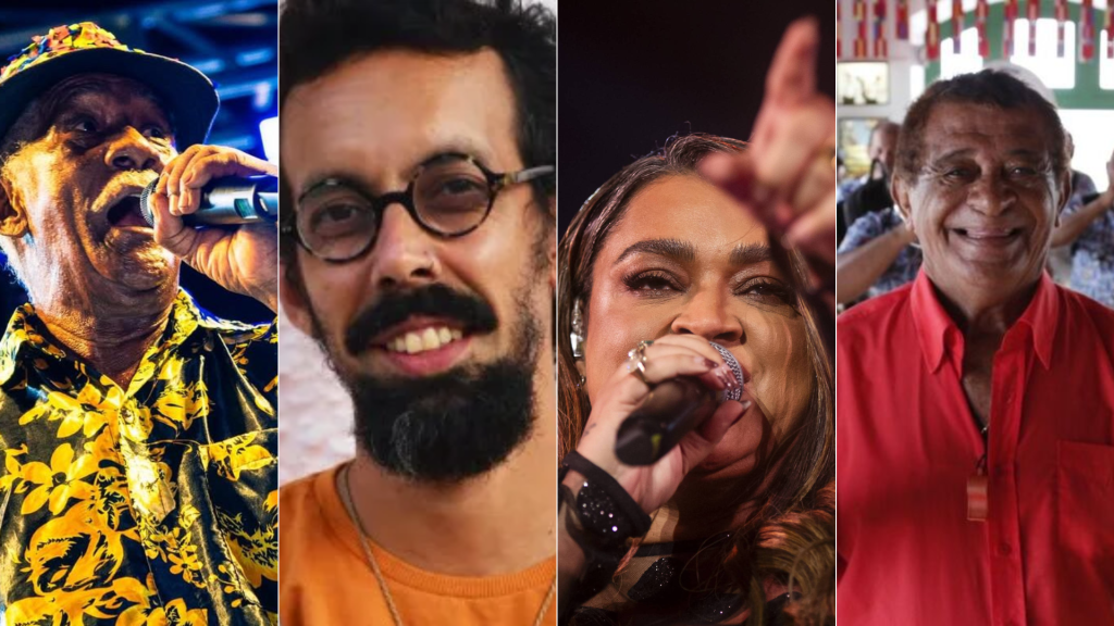 Série especial homenageia artistas brasileiros que faleceram em 2025. Da esquerda para a direita: Nana Caymmi, Lô Borges, Bira Presidente, Elyanna Caldas, Angela RoRo, Hermeto Pascoal, Arlindo Cruz e Mãe Elda de Oxóssi.